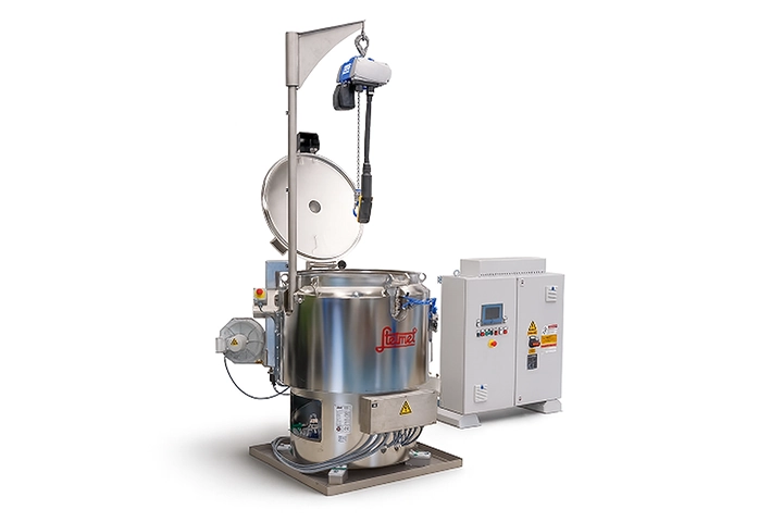 Especially for processing REWORK goods. The chocolate centrifuge is an industrial centrifuge for separating solid components, such as cookies, nuts, pastries, raisins, etc. from chocolate masses. As well as for other applications where a heated jacket is an advantage.