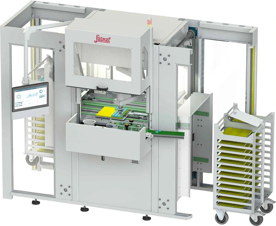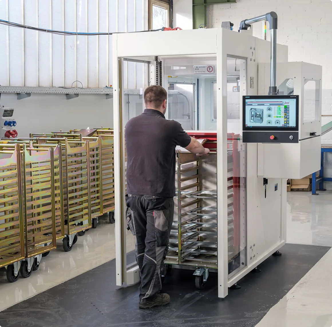 The tray cart is used to hold the carriers and enables them to be changed quickly and safely – ideal for short cycle times and a continuous flow of material.
